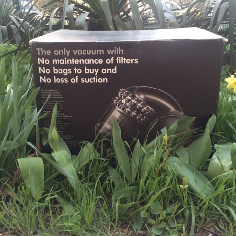 Итак, он дома! Хотя на фото не совсем. Просто я не удержалась, чтобы не похвастаться весной в нашем саду. Если приглядеться, там и тюльпаны пробиваются. Ну и ассоциативный ряд: пылесос Dyson-чистый воздух-весенний воздух в саду. На коробке, к слову, показаны все его внутренности с подробным описанием.